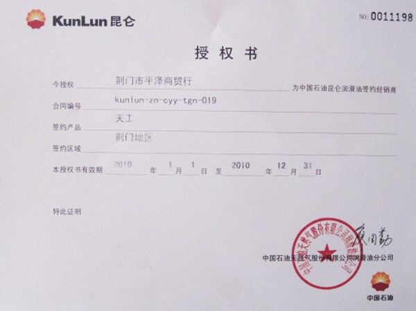 昆侖潤(rùn)滑油授權(quán)書